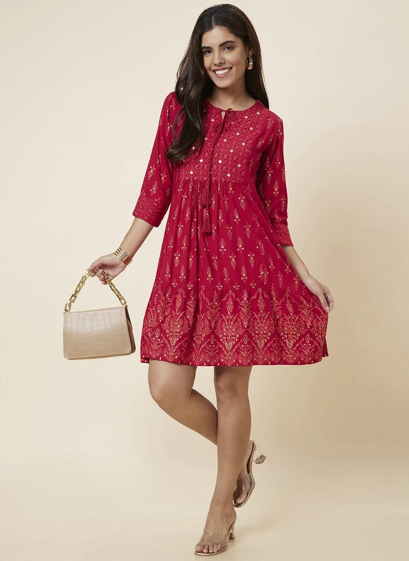 Globus Women Maroon Ethnic Motifs Printed Mandarin Collar Roll-Up Sleeves Straight Kurta