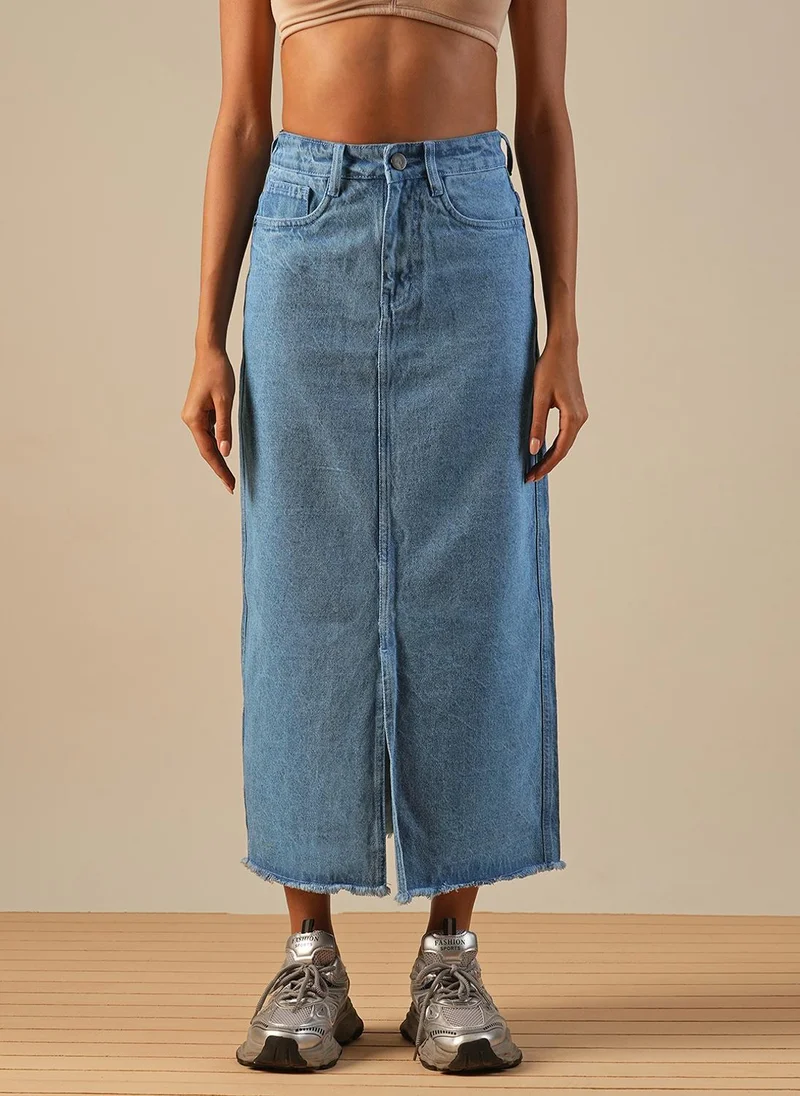 Globus Women Mid-Rise Front Slit Fringed Hem Midi Straight Denim Skirt