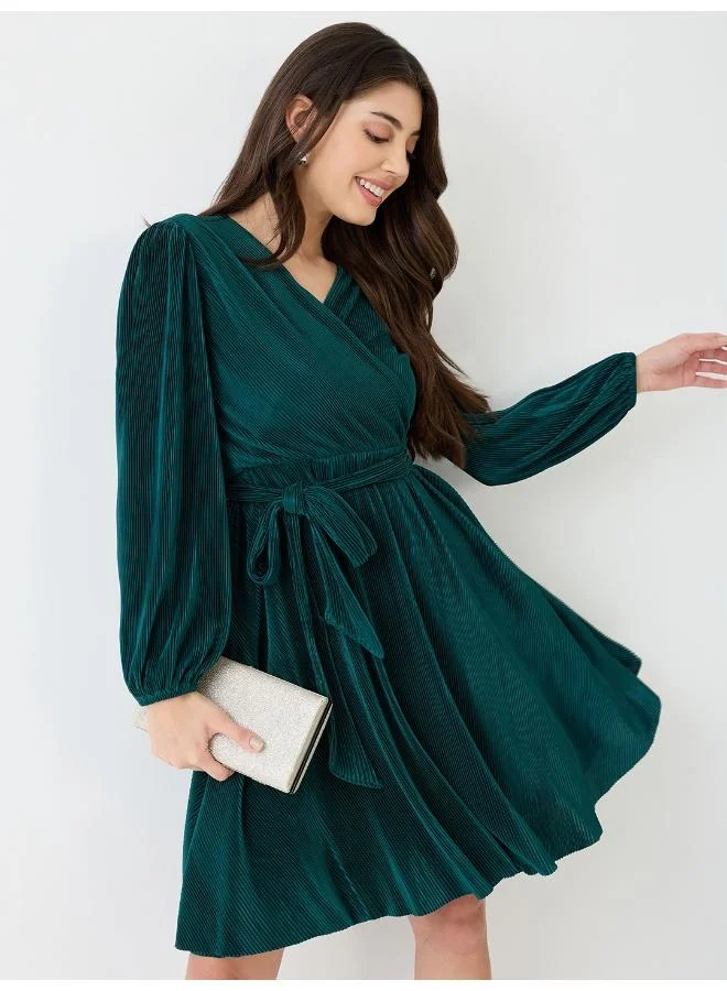 Globus Women Wrap Neck Accordion Pleated Belted A-Line Party Dress