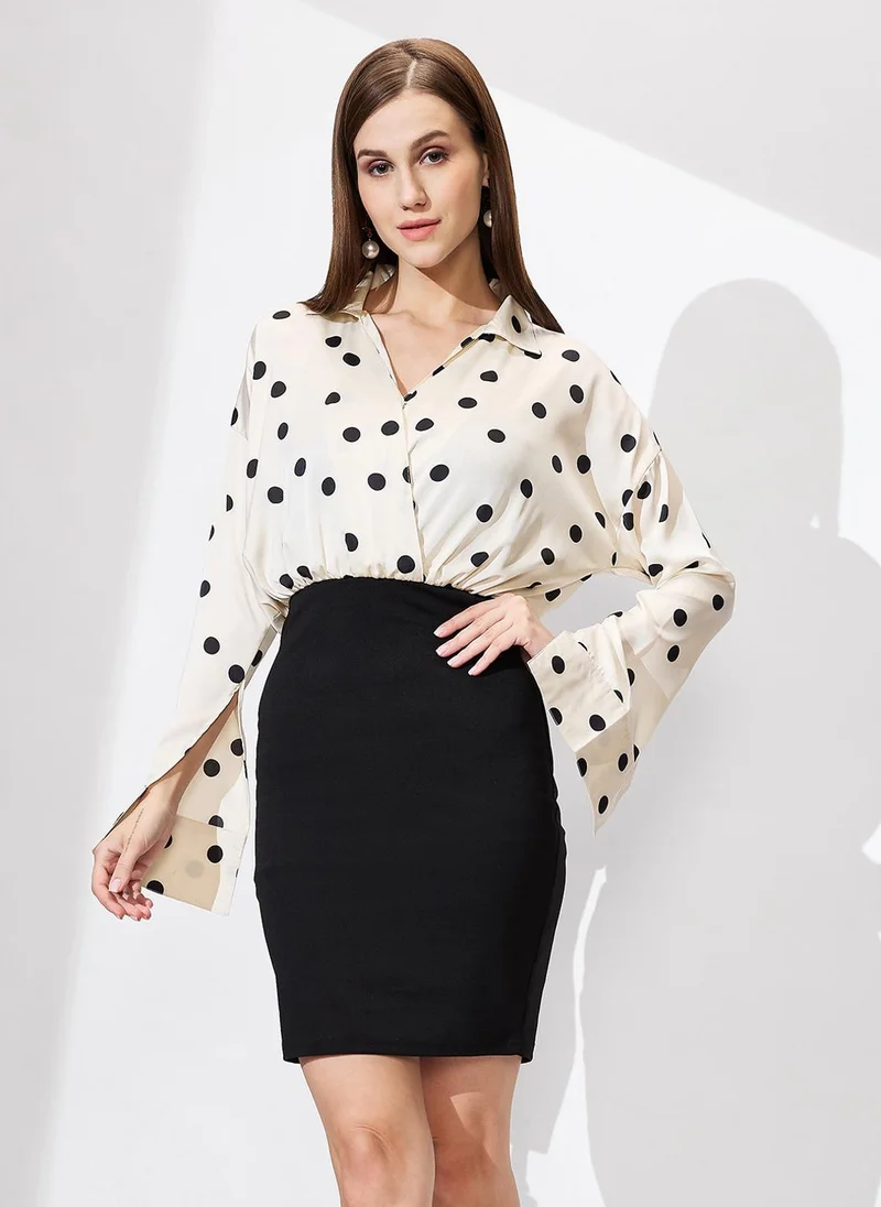 Globus Women Shirt Collar Cuffed Sleeves Polka Dots Satin Gathered Mini Bodycon Workwear Dress