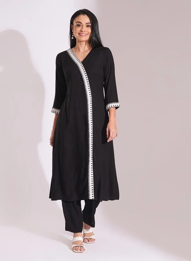 Globus Black Embroidered Detail A-Line Kurta and Pants Workwear Set