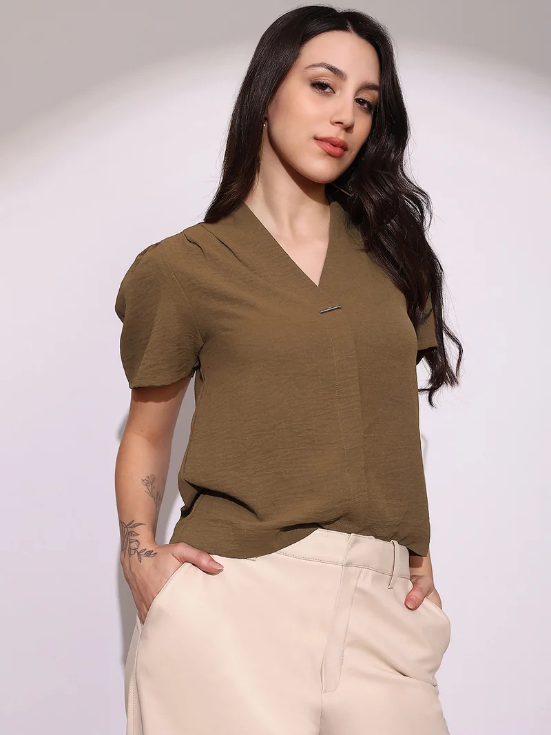 Globus Women White Shirt Collar Puff Sleeves Solid Waist Tie-Up Workwear Peplum Top