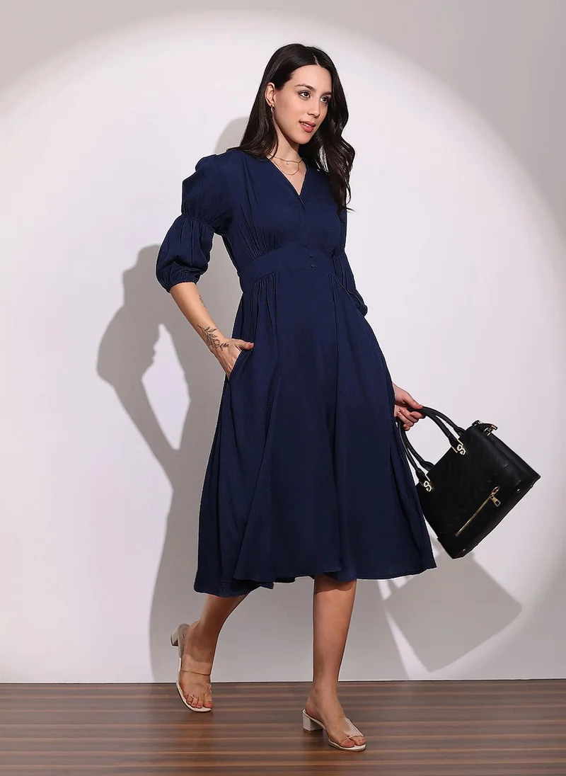 Globus Women Black V-Neck Extended Sleeves Solid Smocked Side Slit Midi Fit & Flare Dress