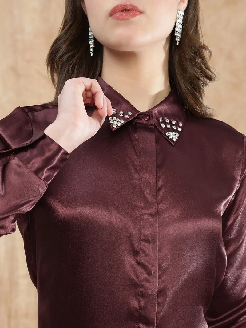Globus Women Red Embellished Spread Collar Cuffed Sleeve Satin Party Shirt