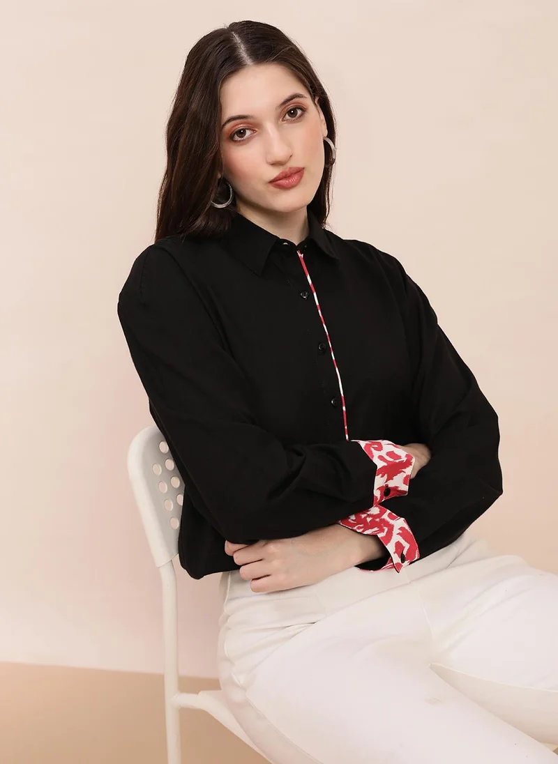 Globus Women Black Collared Neck Printed Placket & Cuffed Sleeves Curved Hem Oversized Shirt