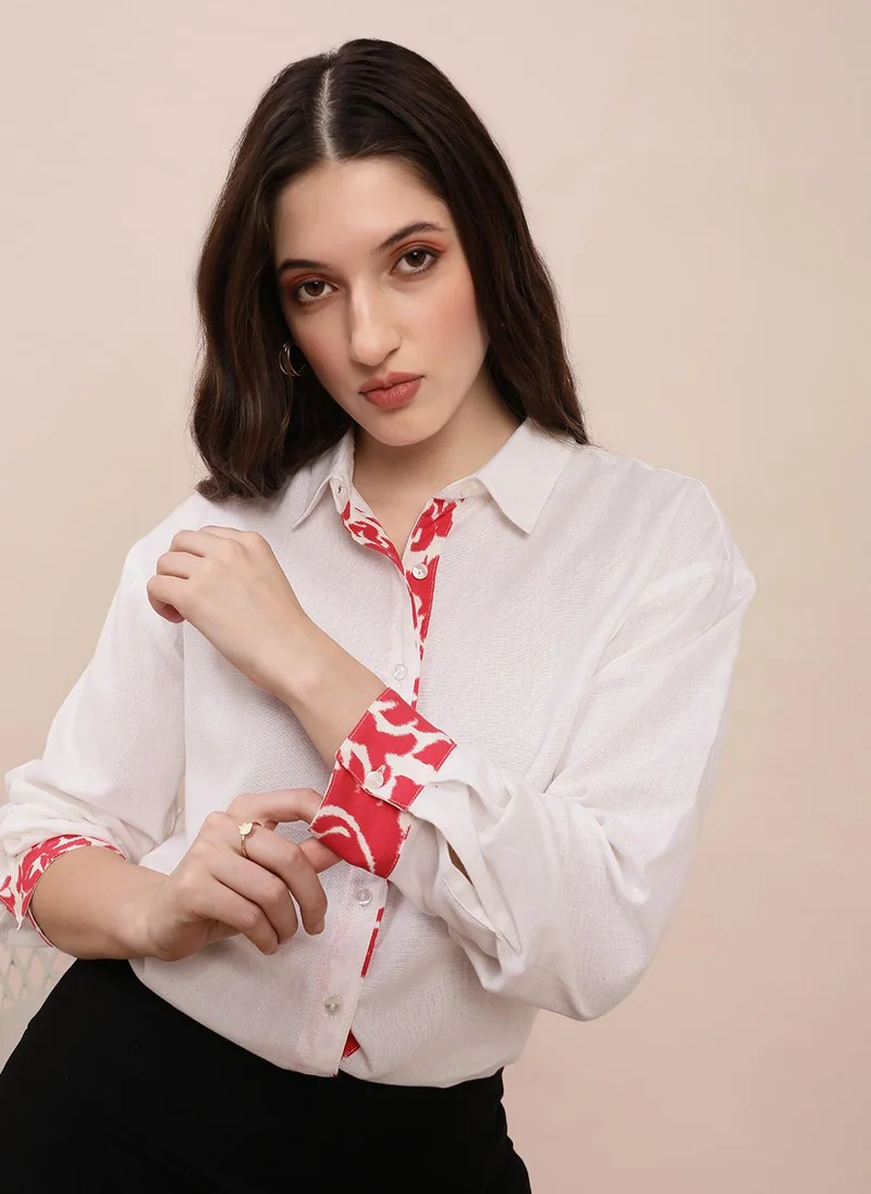 Globus Women Off-White Collared Neck Printed Placket & Cuffed Sleeves Curved Hem Oversized Shirt