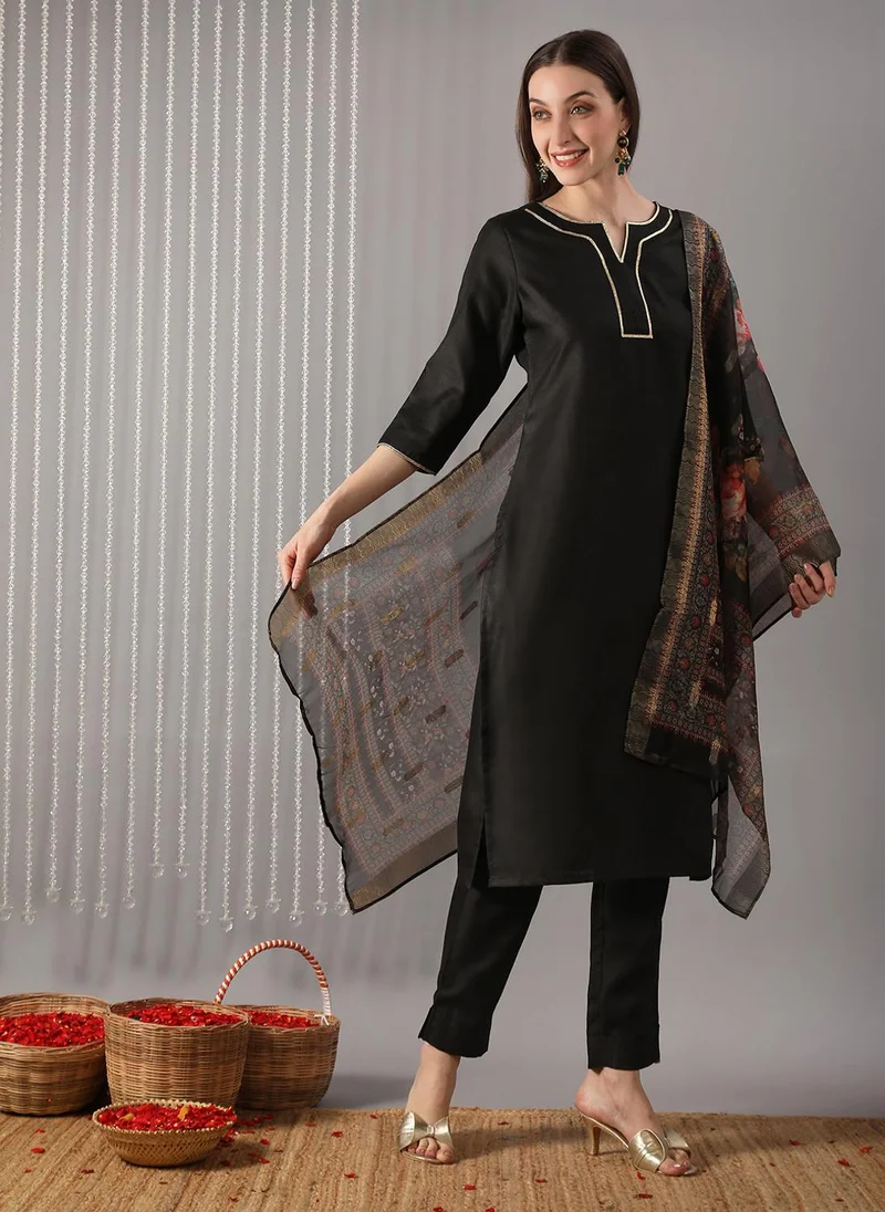 Globus Women Black Round Neck Straight Kurta With Pants & Allover Floral Print Dupatta Festive Set