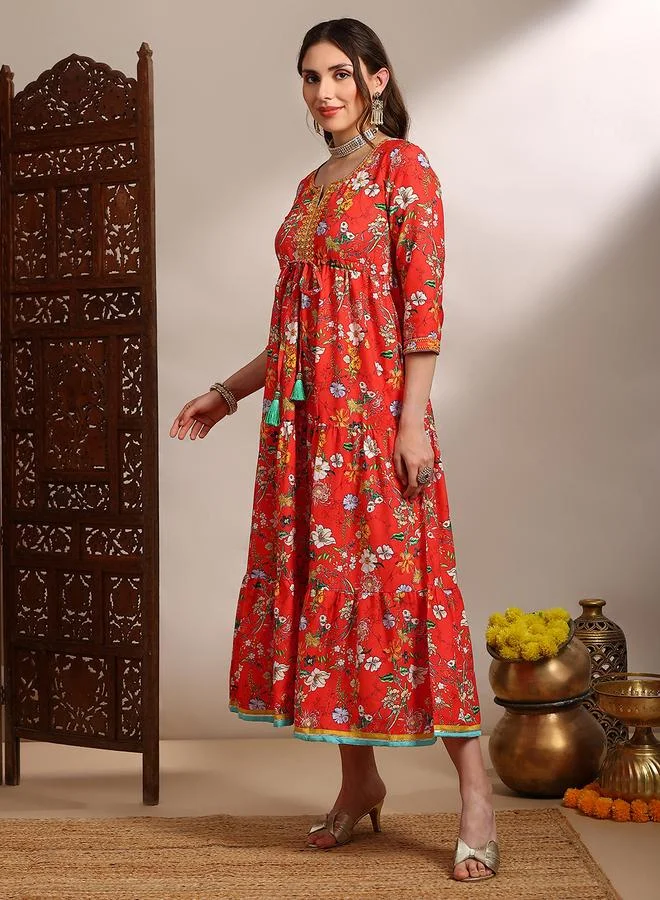 Women Red Floral Print Embroidered Midi Dress