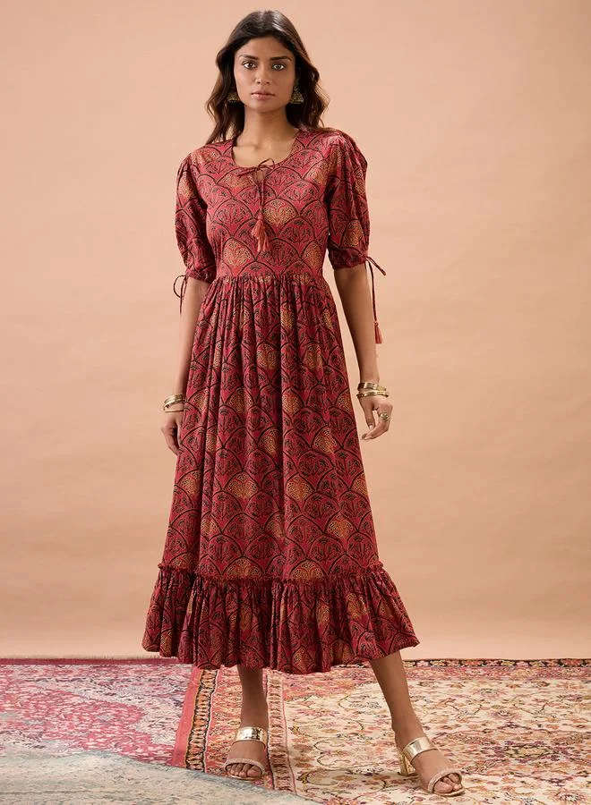 Puff Sleeves Ethnic Print A-Line Midi Dress