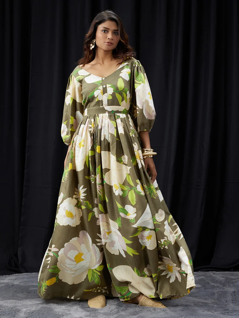 Globus Women Green V-Neck Puff Sleeves Floral Print Pleated Fit & Flare Maxi Dress With Belt