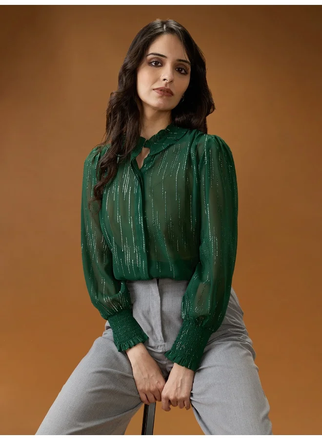 Globus Women Green V-Neck Bishop Sleeves Self Design Lace Shirt Style Top