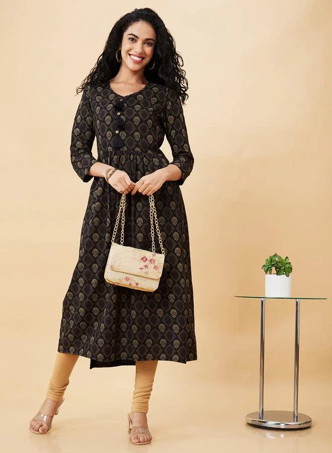 Globus Black Printed V Neck A-Line Kurta