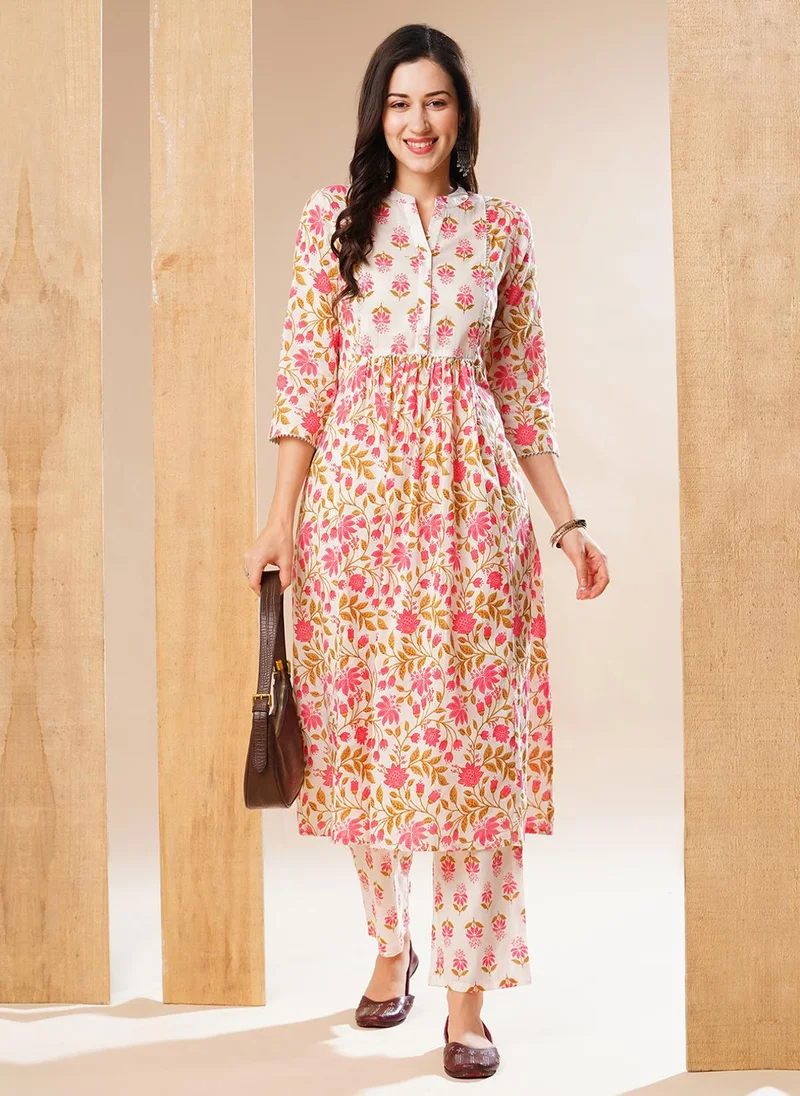 Globus Women Off White Floral Printed Pure Cotton Mandarin Collar A-Line Kurta & Trouser