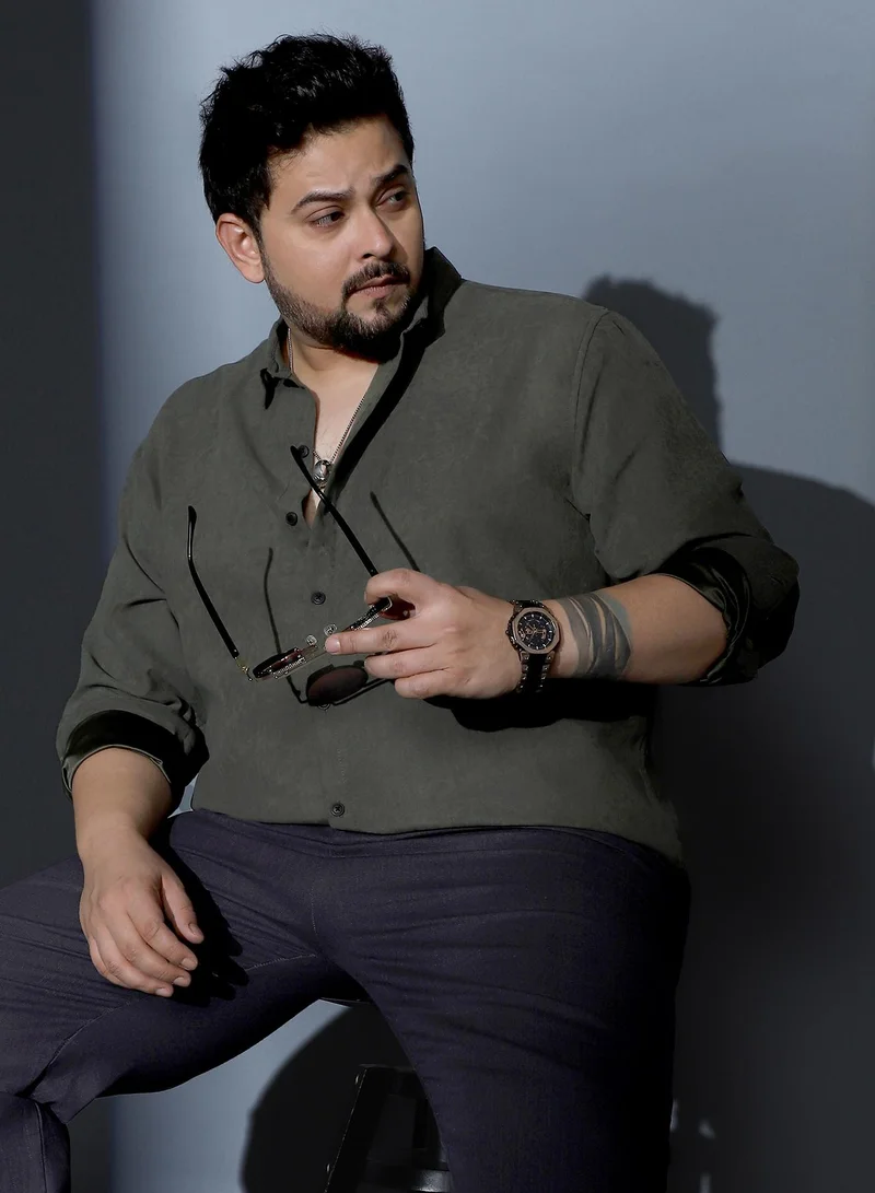 Instafab Plus Men's Coin Olive Grey Overlap Buffalo Shirt For Casual Wear | Spread Collar | Long Cuffed Sleeves | Button Closure | Plus Size Shirt Crafted With Comfort Fit For Everyday Wear