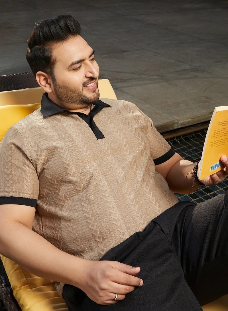 Instafab Plus Men's Ecru Beige Texture-Lined Polo T-Shirt For Casual Wear | Polo Neck | Short Cuffed Sleeves | Half-Button Closure | Plus Size T-Shirt Crafted With Comfort Fit For Everyday Wear