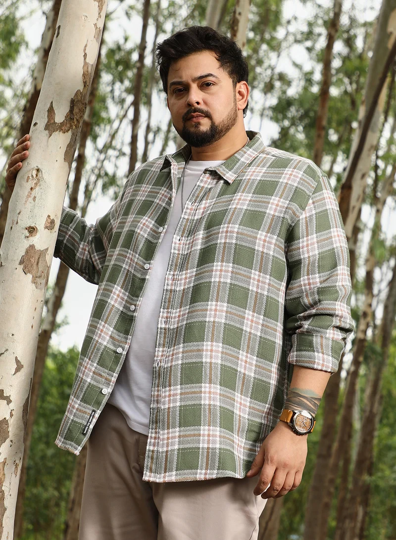 Instafab Plus Men Sonic-Plaid Check Jacquard Shirt | Spread Collar , Long Cuffed Sleeves | Button Closure , Curved Hem | Checks Jacquard | Woven Fabric For Casual & Daily Wear | Light Olive