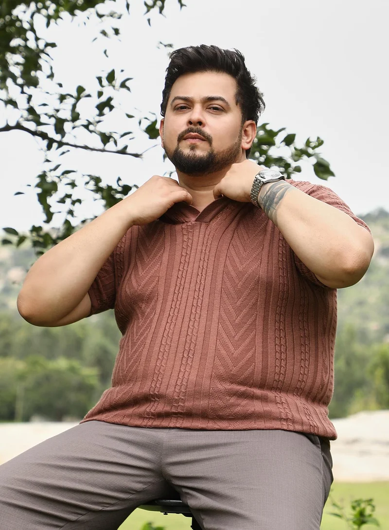 Instafab Plus Men Geometric-Textured Polo T-Shirt | Polo Neck , Short Ribbed Cuff Sleeves | Pull On Closure , Straight Hem | Geometric Jacquard | Knitted Fabric For Casual & Daily Wear | Russet Brown