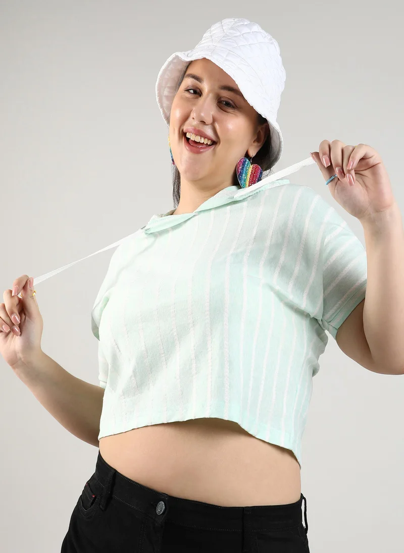 Women's Mint Green Pinstripe Top For Casual Wear | Hooded Neck | Short Sleeve | Plus-Size Top Crafted With Regular Sleeve, Comfort Fit & High-Performance For Everyday Wear