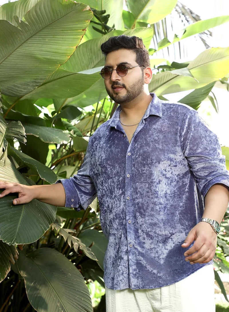 Instafab Plus Men's Cornflower Blue Solid Velvet Shirt For Casual Wear | Spread Collar | Long Cuffed Sleeves | Button Closure | Plus Size Shirt Crafted With Comfort Fit For Everyday Wear