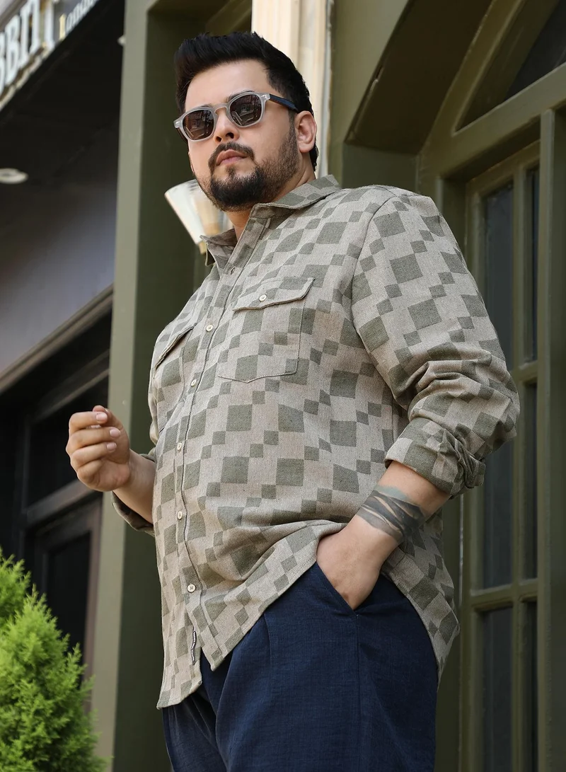 Men's Sage Green Cubic Utility Shirt For Casual Wear | Spread Collar | Long Regular Sleeves | Button Closure | Plus Size Shirt Crafted With Comfort Fit For Everyday Wear