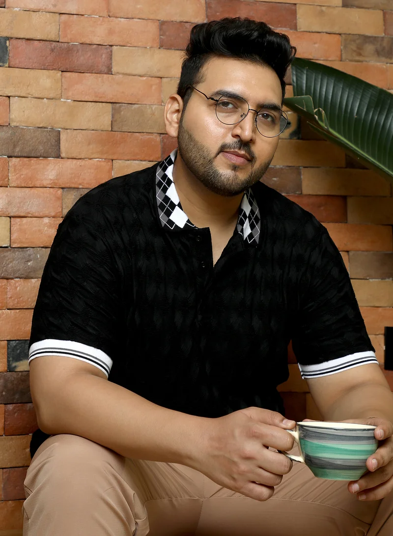 Instafab Plus Men's Black Block Argyle-Knit Polo T-Shirt | Jacquard Polo Neck , Short Sleeves , Button Closure , Straight Hemline | Colourblock Textured Polyester Blend For Office & Casual Wear