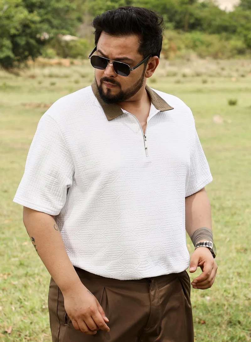 Instafab Plus Men's White & Green Contrast Ribbed Polo T-Shirt For Casual Wear | Polo Neck | Short Cuffed Sleeves | Half-Button Closure | Plus Size T-Shirt Crafted With Comfort Fit For Everyday Wear