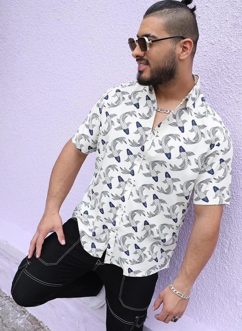 Instafab Plus Men's White Fish Print Button Up Plus-Size Fit Shirt For Casual Wear | Heavy Rayon Spread Collar Shirt Crafted With Regular Sleeve & Comfort Fit For Everyday Wear