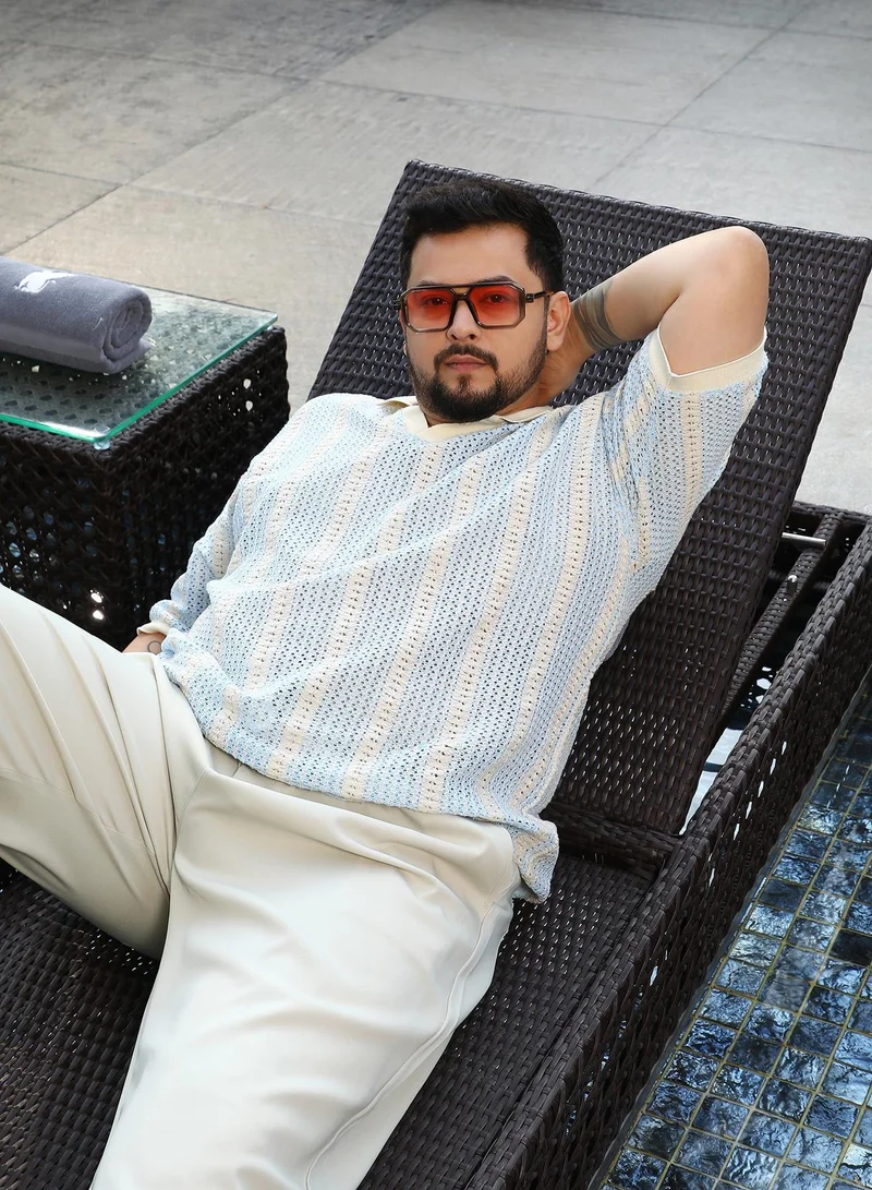 Instafab Plus Men's Brown & Blue Contrast Knitted Shirt For Casual Wear | Spread Collar | Short Sleeve | Button Closure | Cotton Shirts Crafted With Comfort Fit For Everyday Wear