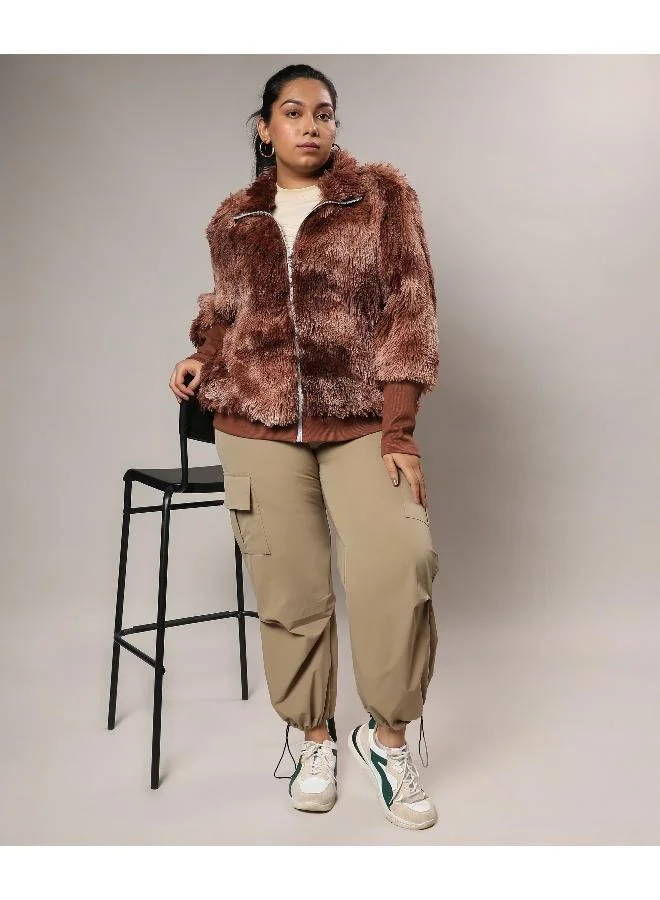 Women's Chalk White Metallic Veined Faux Fur Jacket For Casual Wear | High Neck | Long Sleeve | Zipper Closure | Jacket Crafted With Comfort Fit For Everyday Wear