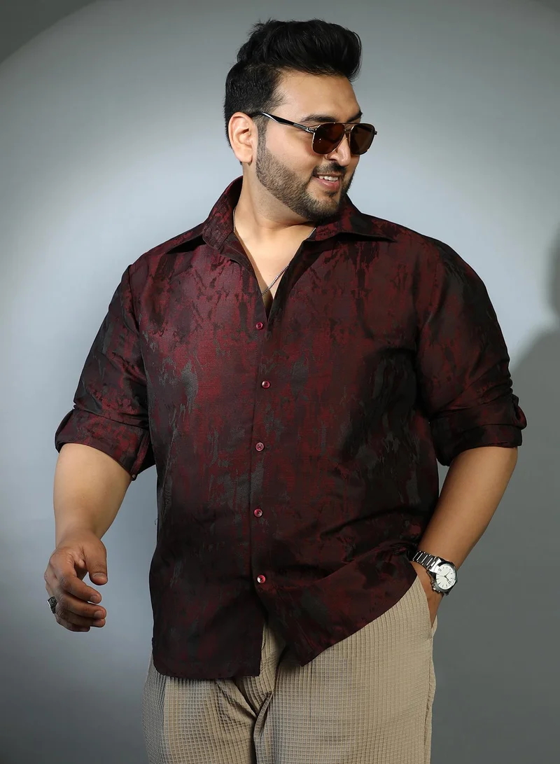 Instafab Plus Men's Burgundy Red Abstract-Woven Shirt For Casual Wear | Spread Collar | Long Cuffed Sleeves | Button Closure | Plus Size Shirt Crafted With Comfort Fit For Everyday Wear
