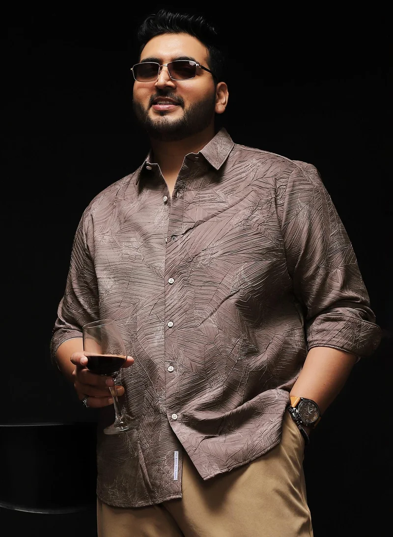 Instafab Plus Men's Peanut Brown Flora-Textured Shirt For Casual Wear | Spread Collar | Long Cuffed Sleeves | Button Closure | Plus Size Shirt Crafted With Comfort Fit For Everyday Wear