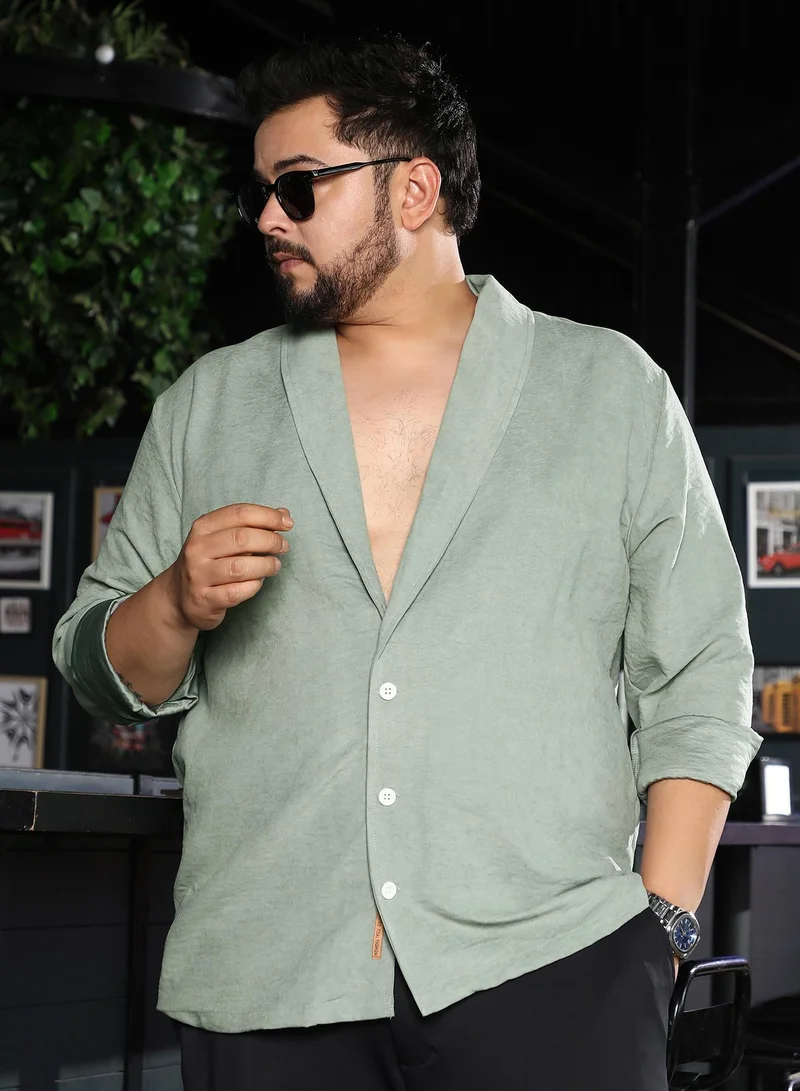 Men Solid Shawl Collar Relaxed Shirt | Shawl Collar, Long Button-Cuff Sleeves | Button Closure, Straight Hem | Solid Creased | Woven Fabric For Plus Size Casual & Evening Wear | Green