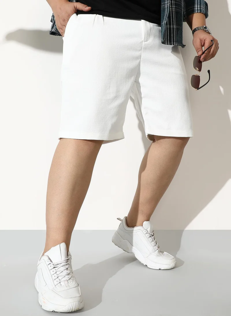 Men Tailored Linen-Blend Shorts | Mid-Rise, Extended-Closure Waistband | Button, Straight Hem | Solid Plain Woven Fabric For Casual & Daily | Chalk White