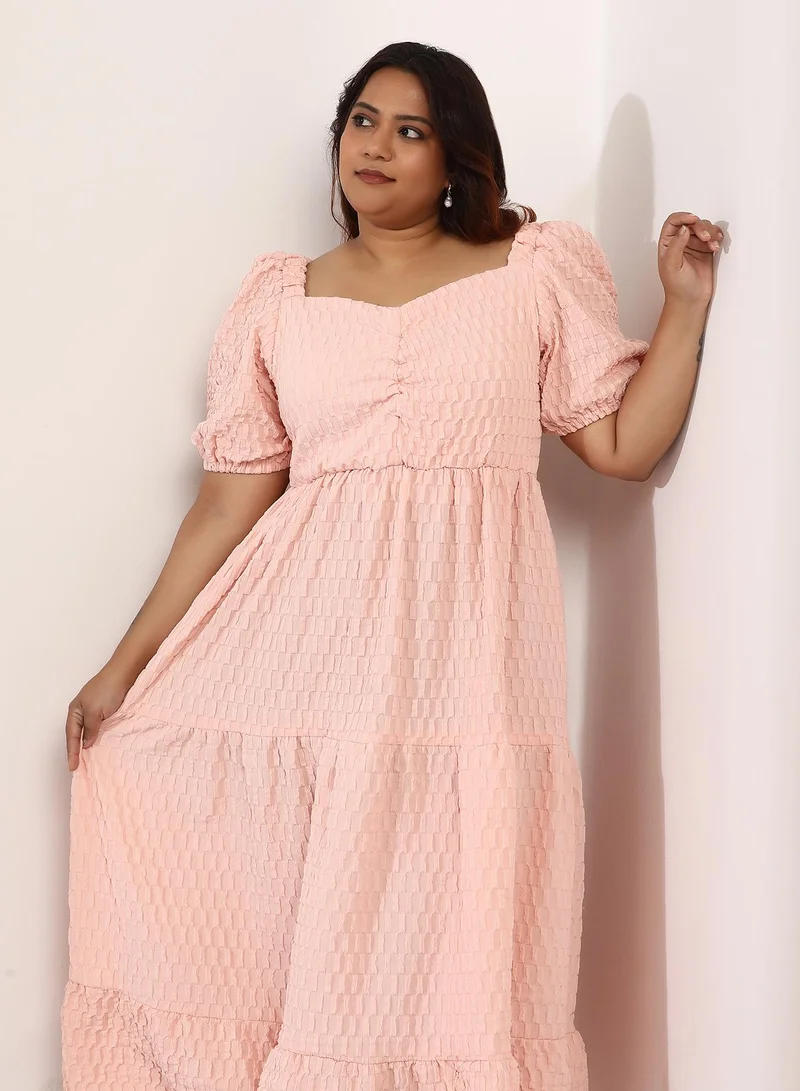 Women's Textured-Tiered Midi Dress | Sweetheart Neck , Short Balloon Sleeves, Pull On Closure | Plus-Size Solid Textured Woven Dress For Casual & Daily Wear | Peach Pink