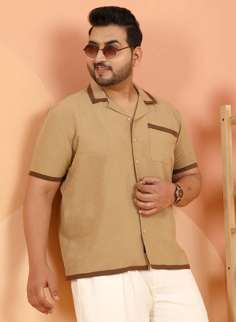 Instafab Plus Men's Khaki Beige Contrast-Cuban Shirt For Casual Wear | Cuban Collar | Short Regular Sleeves | Button Closure | Plus Size Shirt Crafted With Comfort Fit For Everyday Wear