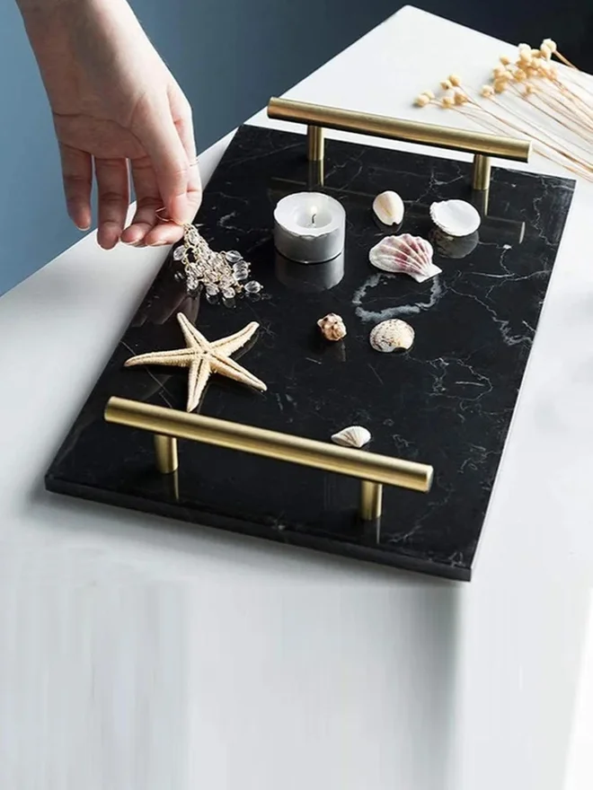 1CHASE Marble Tray with Gold Handle, Black 30x20 cm