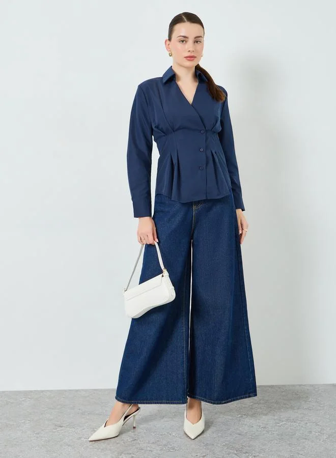 Women Navy Blue Long Sleeve Wrap Top