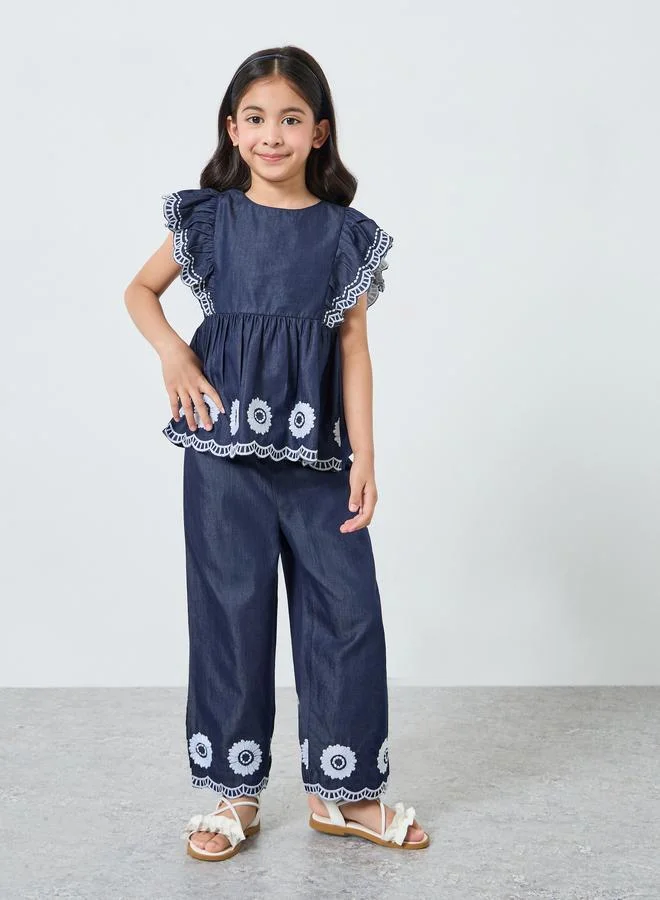 Girls Denim Embroidered Top and Pants Set