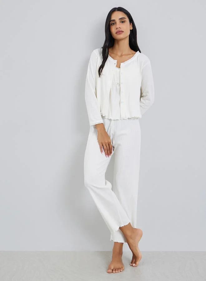 Cream Ribbed Cami with Buttoned Shirt and Pyjama Set