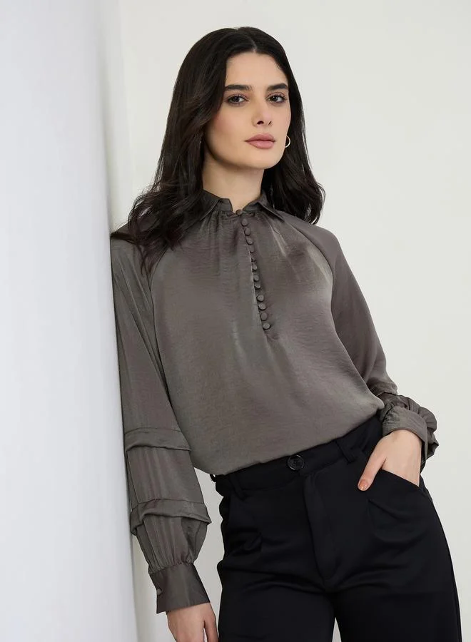 Styli Satin Puff Sleeve Pleated Detail Blouse