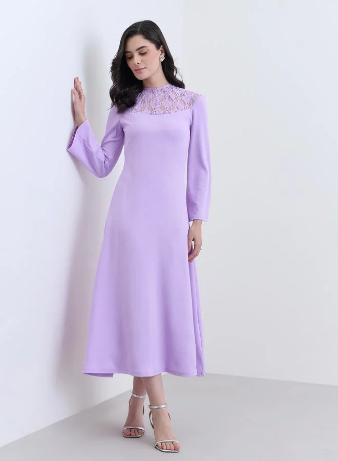Women Purple Lace Detail Long Sleeves Midi Dress
