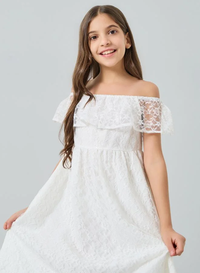 Styli Cutwork Design Square Neck Tiered Maxi Dress