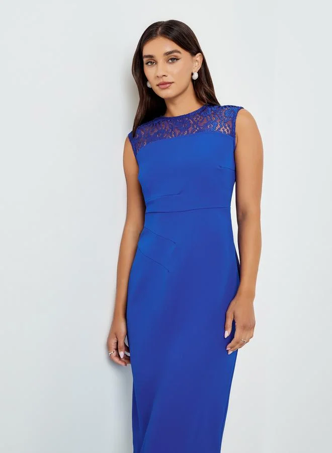 Women Blue Lace Sleeveless Mermaid Hem Maxi Dress