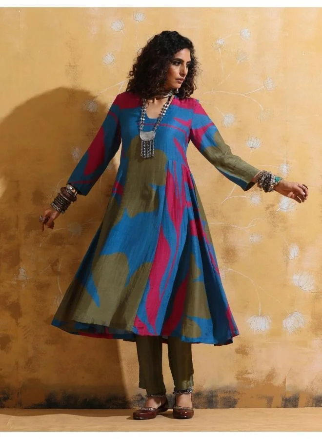 trueBrowns Red Teal Jaal Print Muslin Silk Flared Kurta Set