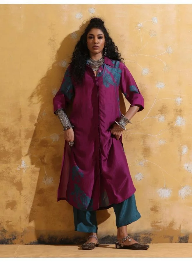 trueBrowns Purple Mustard Floral Print Muslin Silk High-Slit Kurta Set