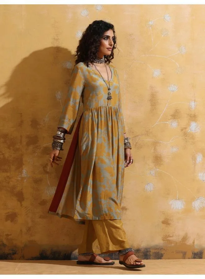 trueBrowns Mustard Gold Foil Print Muslin Silk Kurta Farsi Pants Set