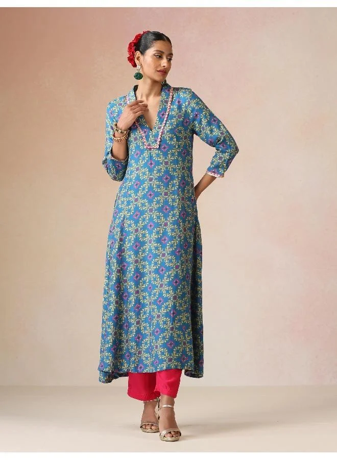 trueBrowns Blue Lime Jaal Print Viscose Flared Co-ord Set