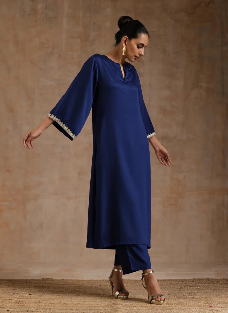 trueBrowns Blue Silver Foil Print Muslin Silk Kurta Farsi Pants Set