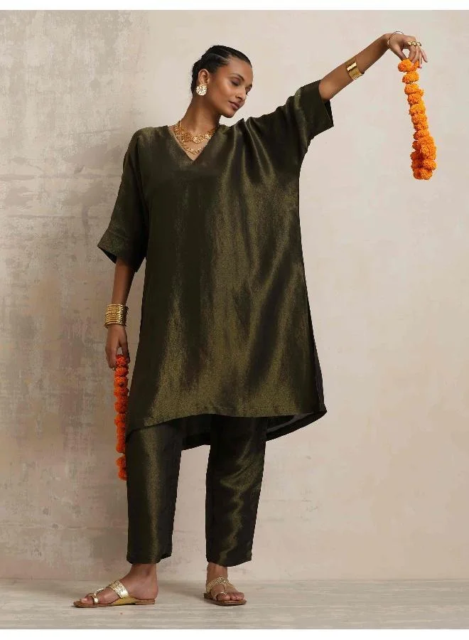 trueBrowns Mustard Gold Foil Print Muslin Silk Kurta Farsi Pants Set