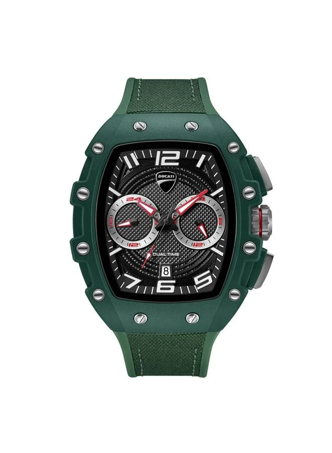 Ducati DT088 Chronograph Watch – Partial See-Through Dial, Black Screw-Detail Case, Green Accents, Leather Strap with Silicone Base, Water Resistant 50M